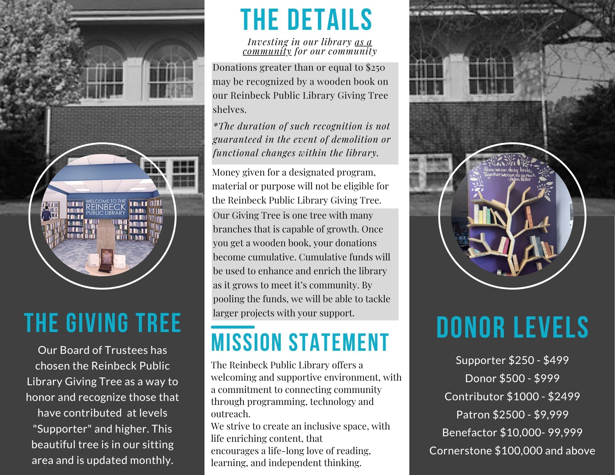 Thank you for your interest in financially supporting the Reinbeck Public Library. Our library can accept donations in the form of check or cash. Donations can be dropped off with a staff member at our front desk or mailed to the Reinbeck Public Library, 501 Clark Street, Reinbeck, IA 50669. Checks must be written out to: Reinbeck Public Library. All donations made that are $250 or above are eligible to be honored on our Reinbeck Public Library Giving Tree. (Pictured Below)