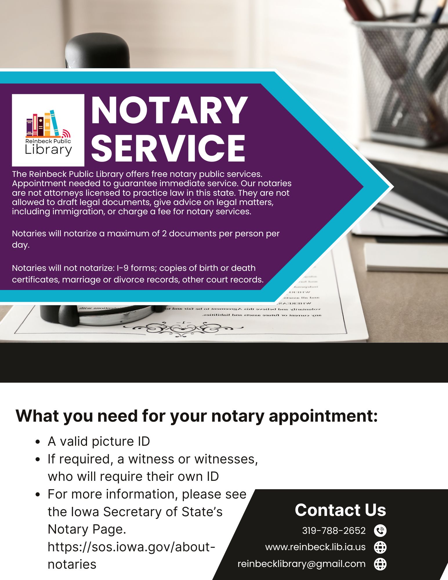 The Reinbeck Public Library offers free notary public services. Appointment needed to guarantee immediate service. Our notaries are not attorneys licensed to practice law in this state. They are not allowed to draft legal documents, give advice on legal matters, including immigration, or charge a fee for notary services.